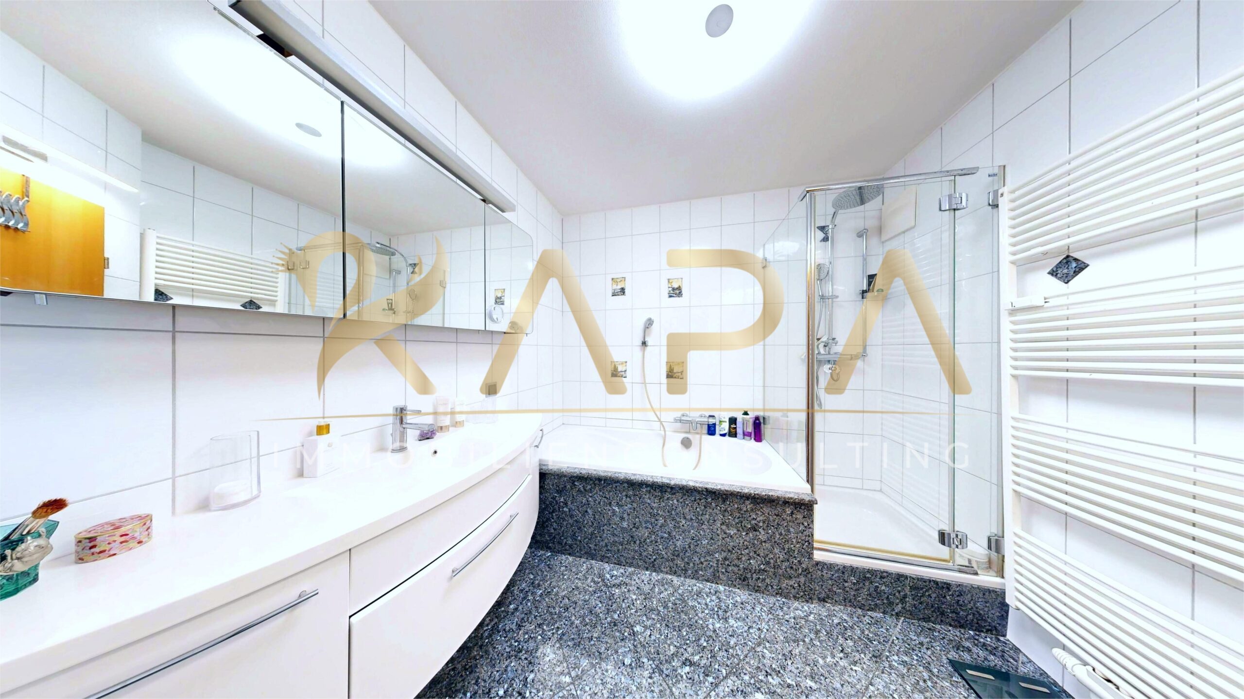 Bei der Ausstattung wurde auf höchste Qualität geachtet: Im Eingangsbereich, im Wohn- und Esszimmer, im Wintergarten sowie im WC wurde edler Granitboden verlegt, der Eleganz und Robustheit perfekt vereint. Auch die Küchenarbeitsflächen greifen diese exklusive Optik auf. Im Badezimmer setzt ein hochwertiger Granit in Schwarz-Silber stilvolle Akzente und unterstreicht das gehobene Ambiente.